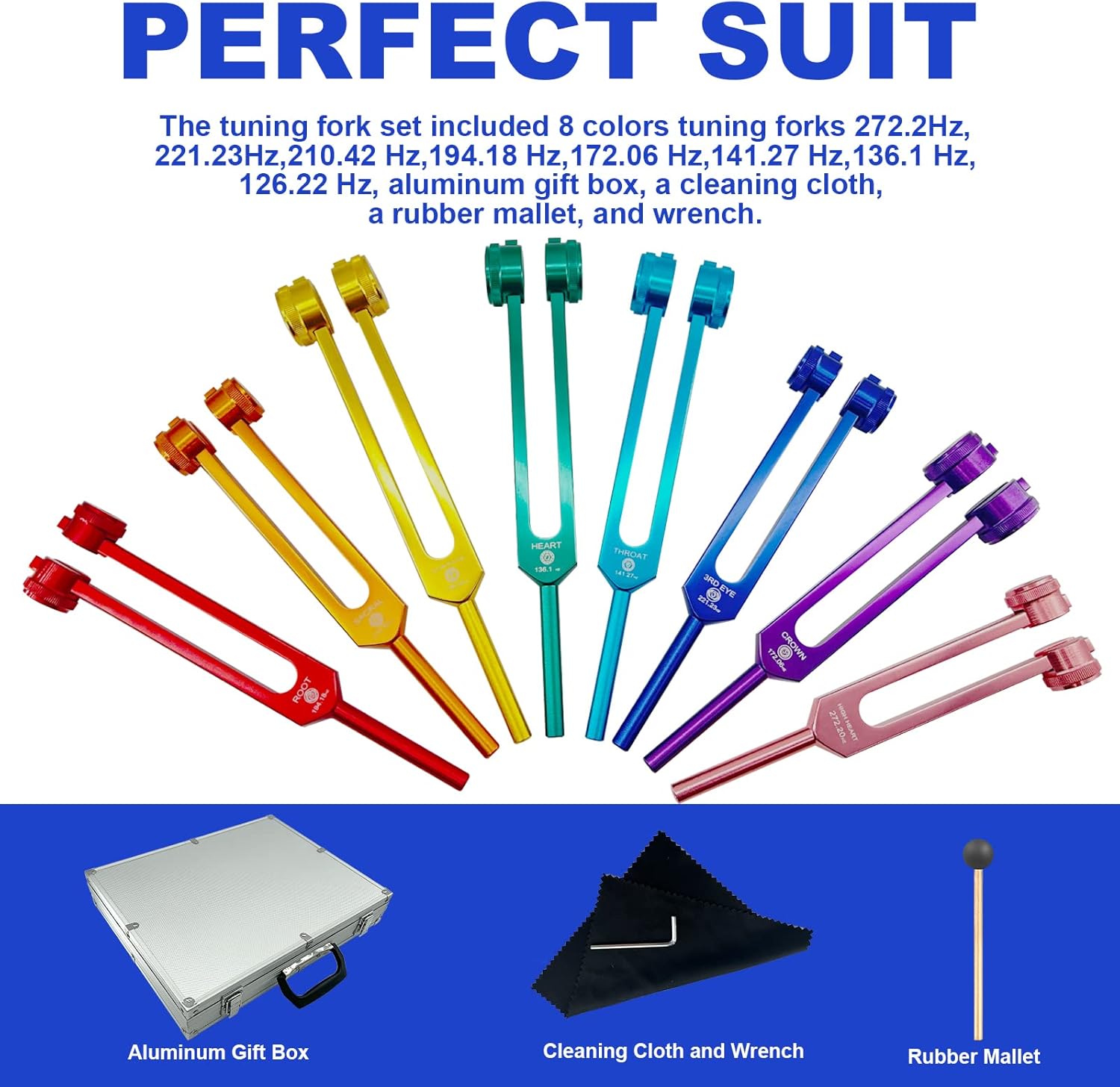 INCLUDED-Our tuning forks set included 126.22 Hz, 136.1 Hz, 141.27 Hz, 172.06 Hz, 194.18 Hz, 210.42 Hz, 221.23Hz, 272.2Hz, aluminum gift box, cleaning cloth, rubber mallet, and wrench.