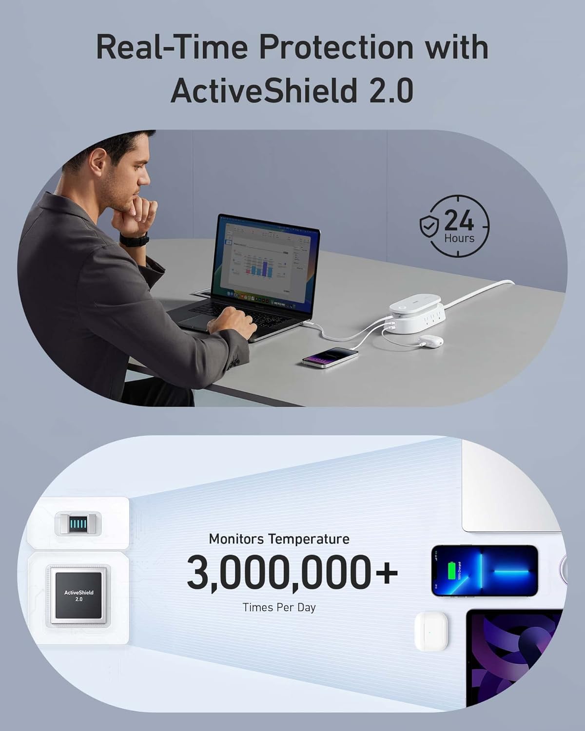 ActiveShield 2.0: Anker's proprietary technology enhances protection by intelligently monitoring temperature over 3 million times per day and adjusting power output to safeguard your connected devices.