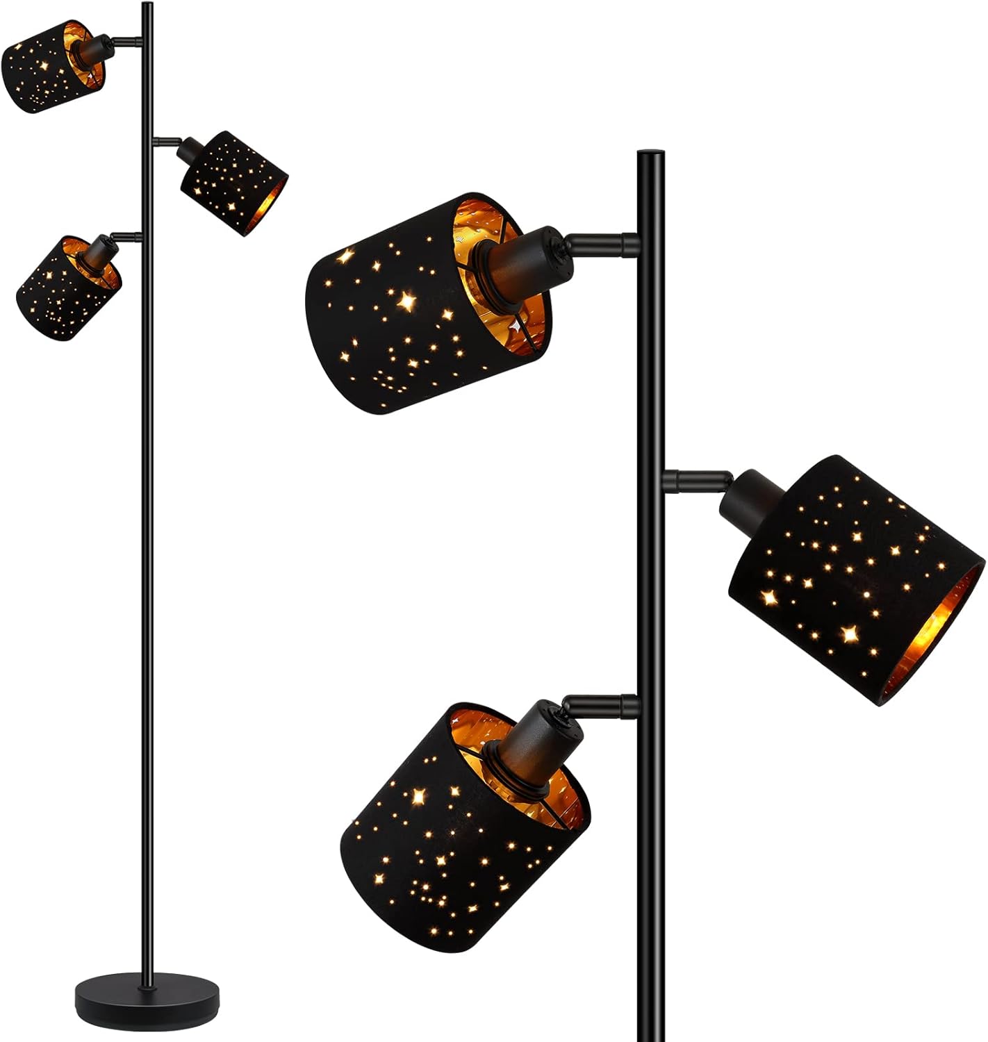 ?Unique 3-Head Floor Lamp - This 63 inch tall modern floor lamp features 3 decorative star lampshade made of black textile with gold PVC inside that matches both modern and traditional décor while adding a cool design to your home. This led standing lamp takes up little space and delivers a warm ambiance as its three lights emit a cozy glow that gives you a comforting, welcoming feeling.