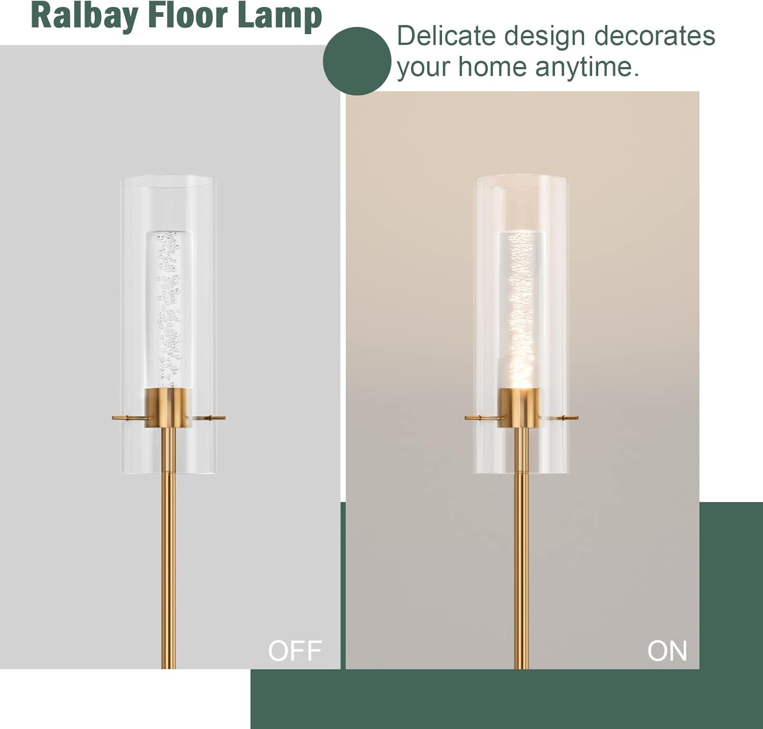 【Gold Tall Floor Lamp with Clear Glass Shade】- Overall size: 9.8" W x 9.8" D x 62.99" H(25 x 25 x 160 cm). Glass shade size: 3.74" W x 11.81" H(9.5 x 30 cm); LED acrylic size: 1.97" W x 6.5" H(5 x 16.5 cm). Slim and slender, tall and sleek. This modern gold tall standing light with glass shade is the perfect way to light up a lounge, bedroom, living room or office space.