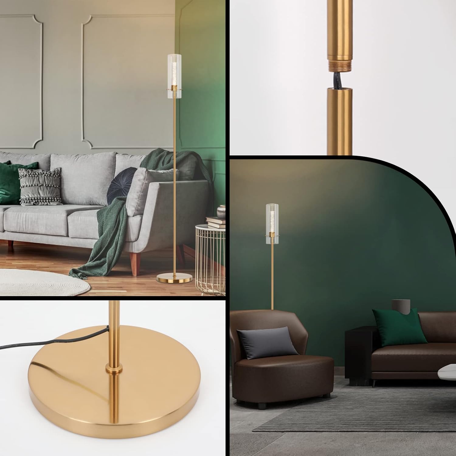 【Glass LED Floor Lamp】Modern torchiere LED floor lamp uplight with clean, simple yet modern lines, slim and sleek design, an natural complement to fashion-forward furniture and home lighting. The rich gleam of the brass gold finish pairs beautifully with the clear glass lampshade and LED acrylic crystal to create a stunning look and shining lighting effect.