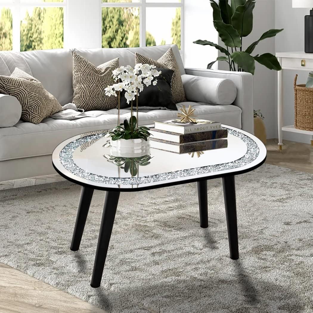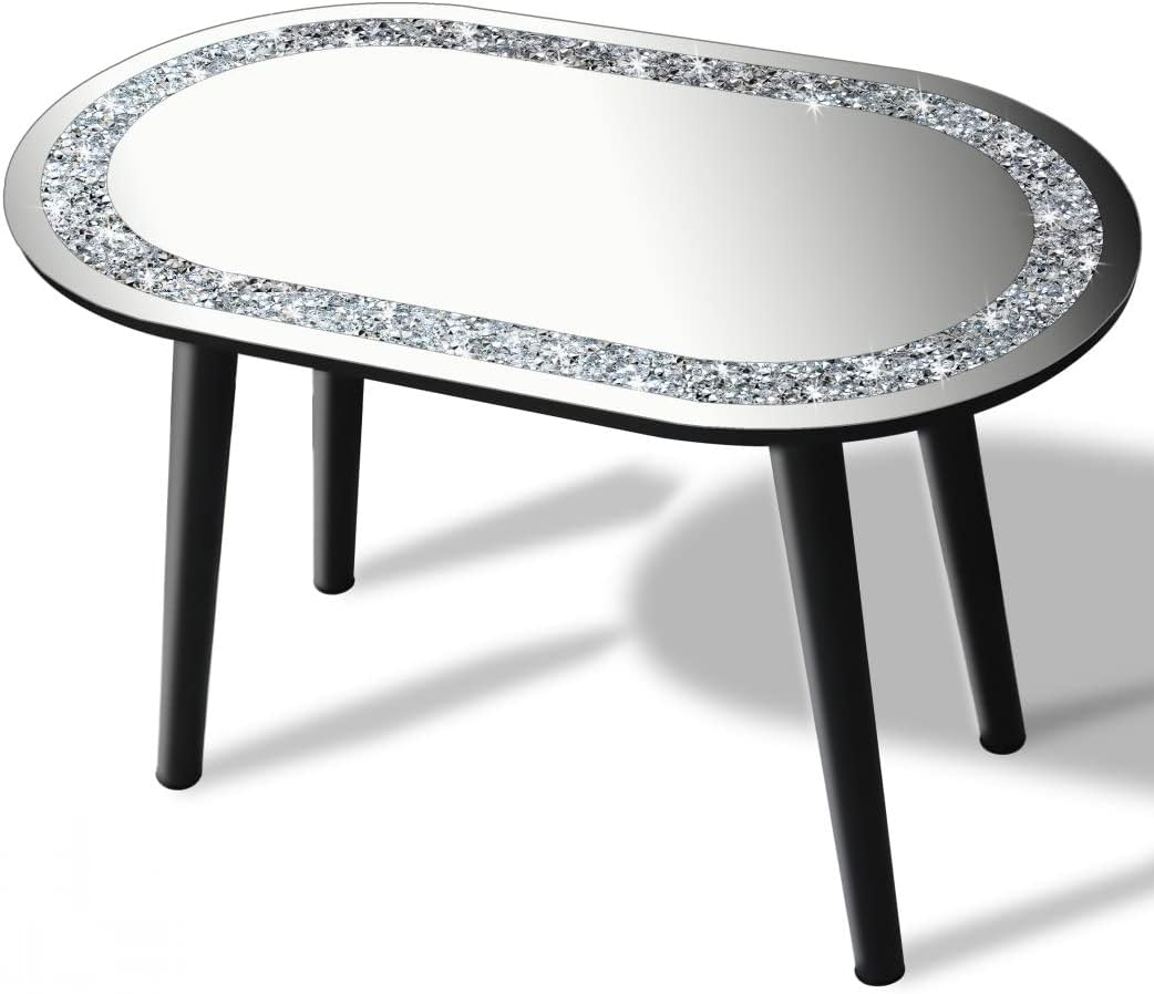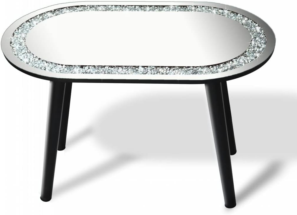Diamond Mirror Coffee Table Dimension: Oval tabletop 32x19 inches, assembled with 4 legs, height start from floor is 20 inches . Twinkle silver bling sparkly crushed diamond crystal mirrored coffee table. Luxurious and stylish mirrored coffee table furniture.